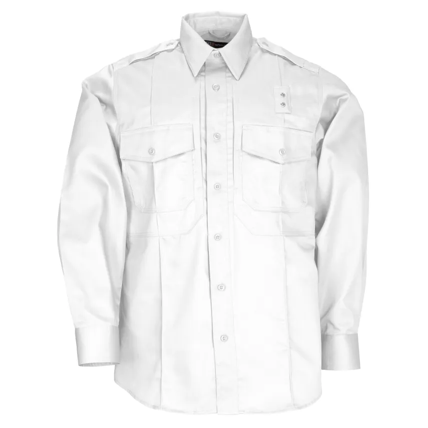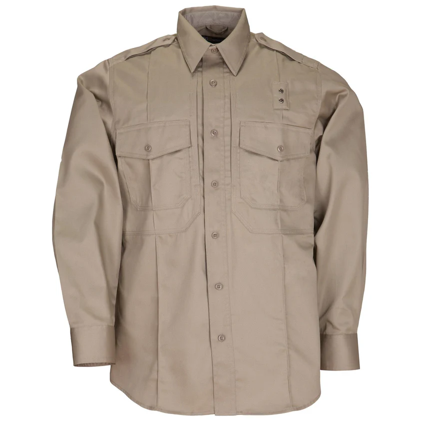 La camisa de manga larga 5.11® Twill PDU® Clase B, creada con aportes de operadores en el campo, cumple con los más altos estándares de los agentes de la ley en entornos de trabajo exigentes. Esta camisa de sarga de poliéster y algodón de 5.78 oz ofrece durabilidad, rendimiento confiable y comodidad. Con un tratamiento de Teflon® que resiste manchas, humedad y suciedad, y el bolsillo patentado 5.11® Ready Pocket™ en el pecho para documentos o teléfono, proporciona almacenamiento oculto y accesible. Su diseño de hombros bi-swing permite máxima movilidad, y los pliegues militares cosidos, junto con las varillas de cuello integradas, garantizan una apariencia profesional. Las ventilaciones en las axilas, charreteras y acceso al cable del micrófono completan esta camisa funcional. Disponible también en manga corta.